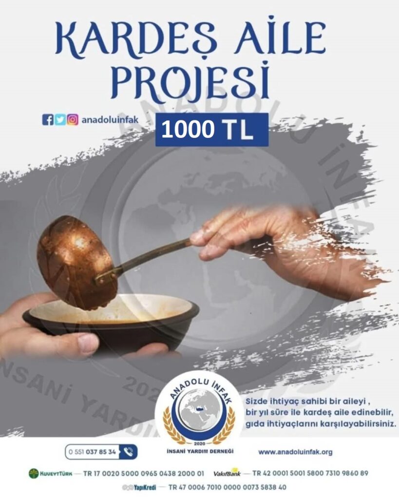 Kardeş Aile projesinde ki amacımız hayat standardı yüksek ve orta aileler ile yoksul ve mazlum aileler arasında ”manevi kardeşlik” köprüleri kurmaktır. Bu projemiz ile ihtiyaç sahibi bir aileye kardeş aile olabilir, ihtiyaçlarını karşılayabilir yada Ailenin ihtiyaçlarını yerinde görüp bizzat yardım ulaştırabilirsiniz.