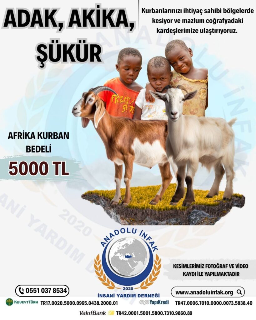 Adak, akika, şükür kurbanlarınızı yut içi ve yurt dışında islami usullere göre kesip ihtiyaç sahibi ailelere ulaştırıyoruz. Bağışçılarımıza resim, video kaydı gönderilmektedir.